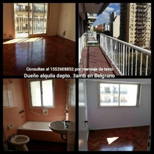 .Dueño alquila depto. de 3 amb, en el Barrio de Belgrano, a 3 cuadras de Av. Cabildo y Juramento/ a 1 cuadra de Av. Cramer y a 3 cuadras de estación de trenes Belgrano R y cerca de estación de trenes Belgrano C. Esta ubicado en un 5to. Piso a la calle con balcón corrido en todo el ancho del depto. Es muy luminoso con todos los ambientes al exterior incluido el baño, con muy buena ventilación. Tiene calefacción por piso radiante. Es un edificio en torre. Alquiler 890.000 $. Consultas por mensaje de texto al celular 1552608852.